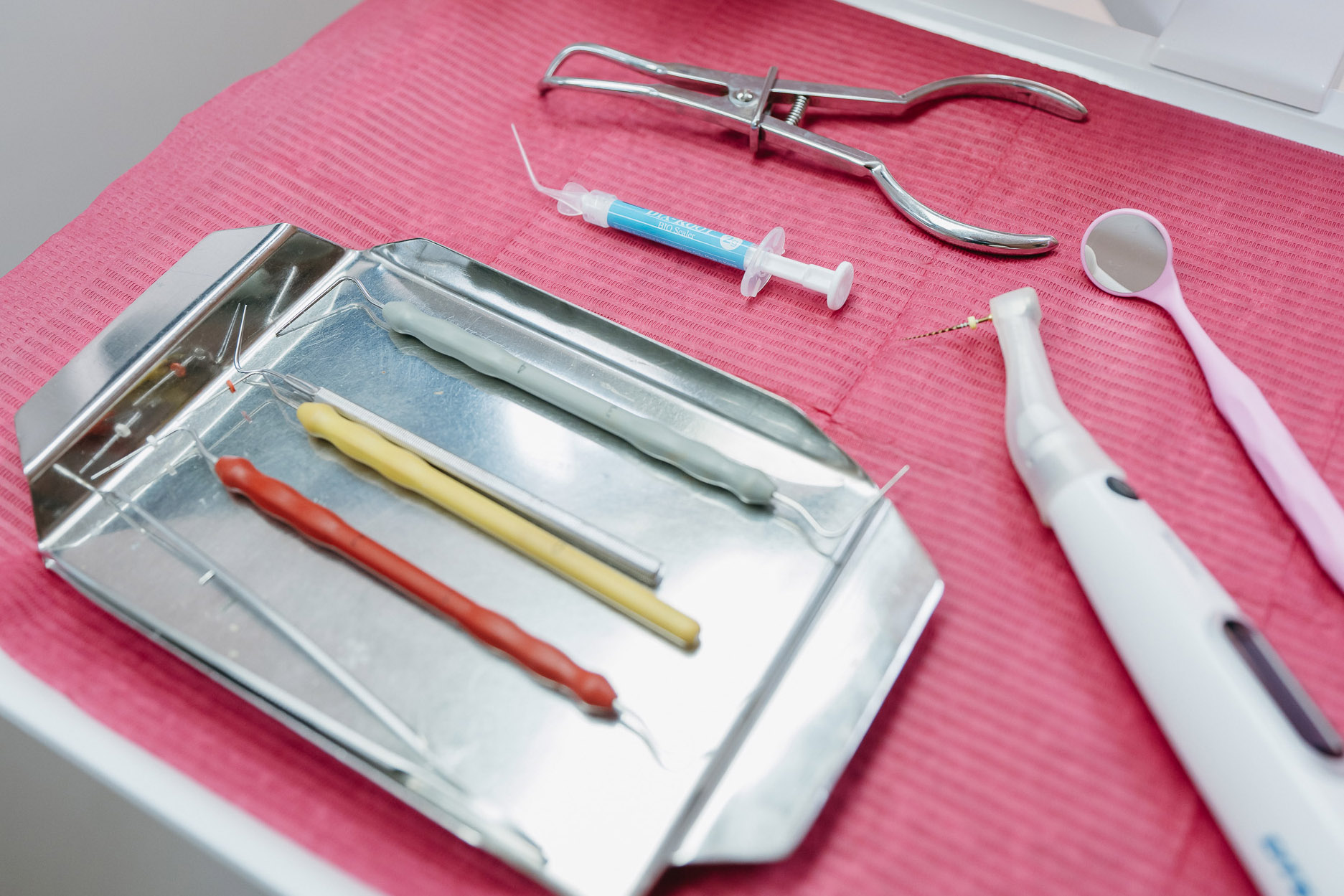 K ošetření kořenových kanálku používáme nejmodernější nástroje i materiály, standardem je použití lokální anestezie, kofferdamu, optimálního výplachového protokolu a samozřejmě použití zvětšovacích pomůcek jako jsou lupové brýle a operační mikroskop, díky nimž je ošetření kvalitnější, přesnější a s lepší dlouhodobou prognózou.
